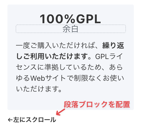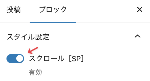 以上の設定で、スマホ画面サイズ(600px未満)でページを表示したい場合に限り、段落ブロック←左にスクロールが表示されます。