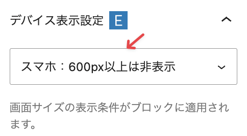 カラムブロックに対してデバイス表示を指定します。下記の例では、スマホ:600px以上は非表示を指定しています。