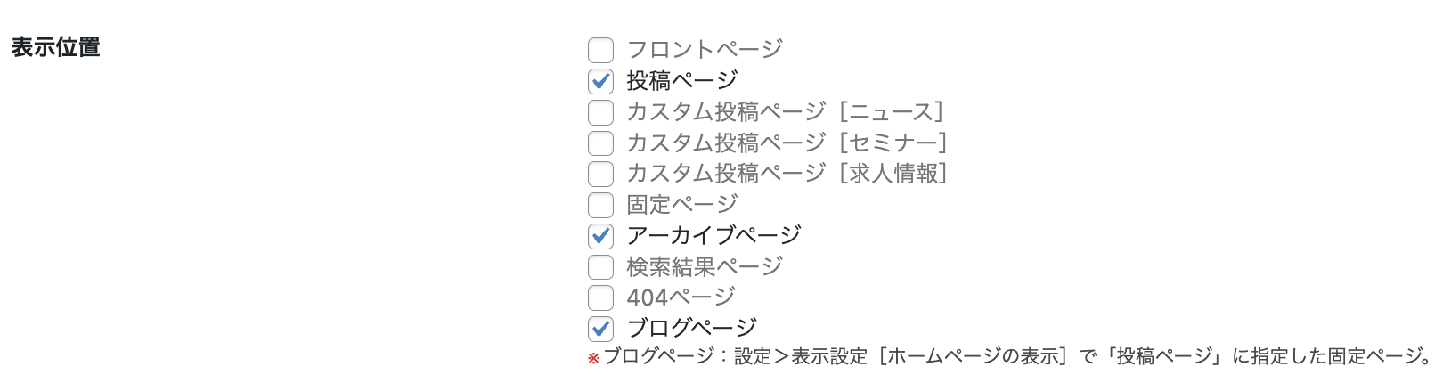 表示位置とは、どの種類のページでヘッダーニュースを表示するのか指定する機能です。チェックを入れることで表示対象となります。
