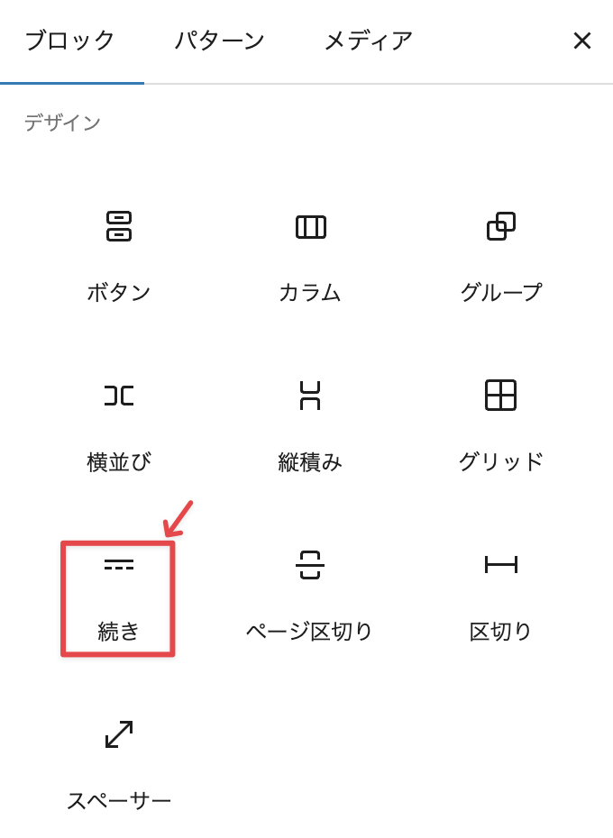 投稿ページの編集画面では下記のように続きブロックを配置しています。