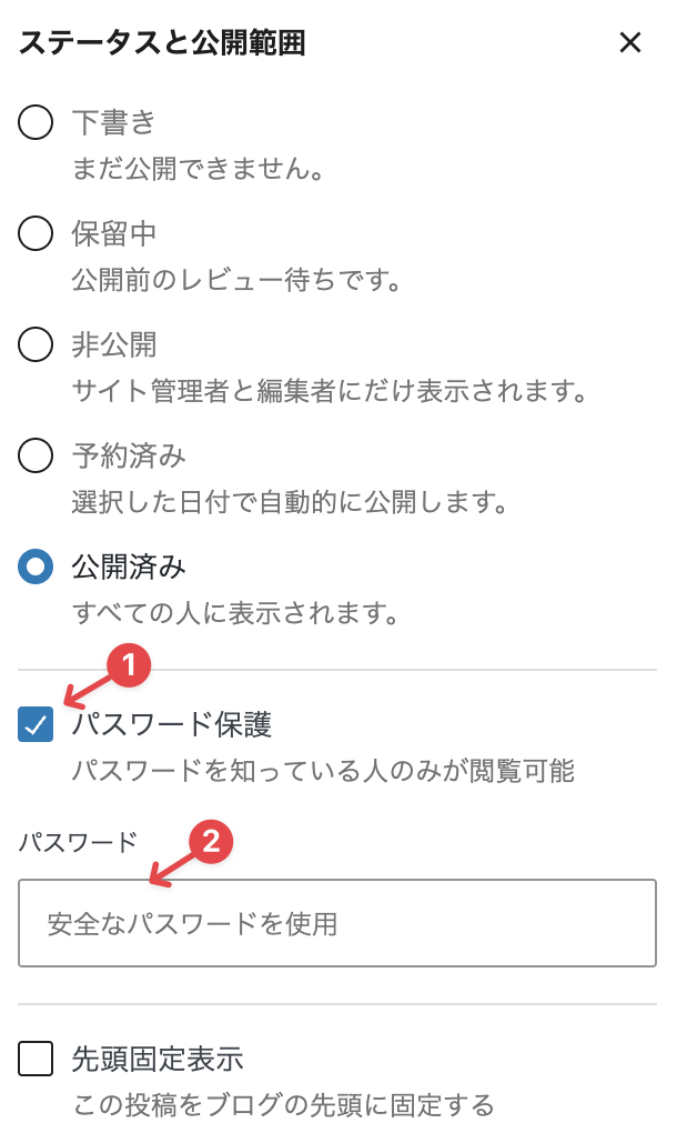 Emanon設定 パスワード保護は、公開状態が「パスワード保護」のページに適用される機能です。ページタイトルに自動挿入される「保護中:」の表示設定、パスワードページの文言設定やボタン設置が可能です。
