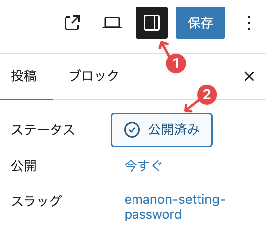 パスワード保護を設定したいページの編集画面に進み、画面右側にある「ステータスと公開状態」の表示状態(公開)をクリックします。