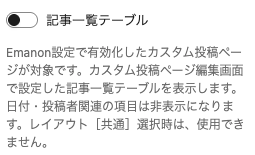 下記の図は、カスタム投稿ページ編集画面の下部に表示される記事一覧テーブル設定です。Emanon設定>カスタム投稿>記事一覧テーブル設定のスタイルで非表示以外を指定すると表示されます。