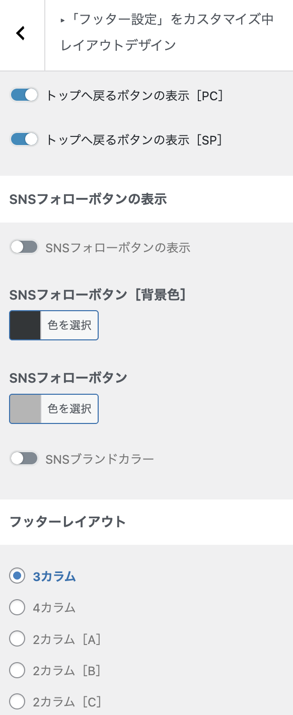 WordPress管理画面 > 外観 > カスタマイズ > フッター設定 > レイアウトデザインをクリックすると下記画面が表示されます。
