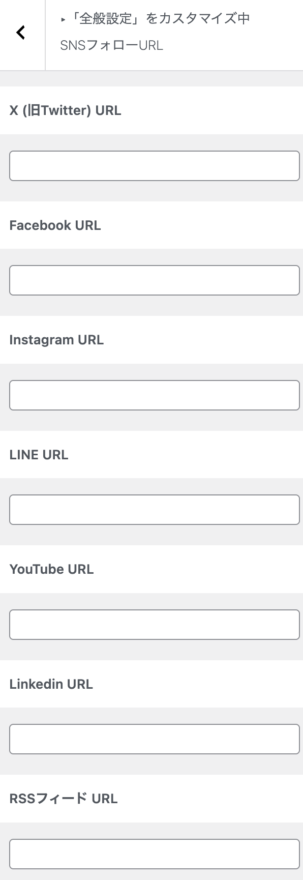 SNSフォローボタンは、WordPress管理画面 > 外観 > カスタマイズ > 全般設定 > SNSフォローURLで設定を行います。