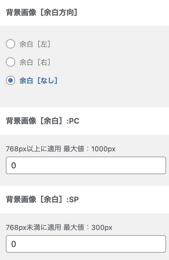 背景画像の左または右に余白をpxで指定する機能です。背景画像[余白方向]で余白が発生する向きを決め、背景画像[余白 ]:PCと背景画像[余白 ]:SPで余白の大きさを調整します。
