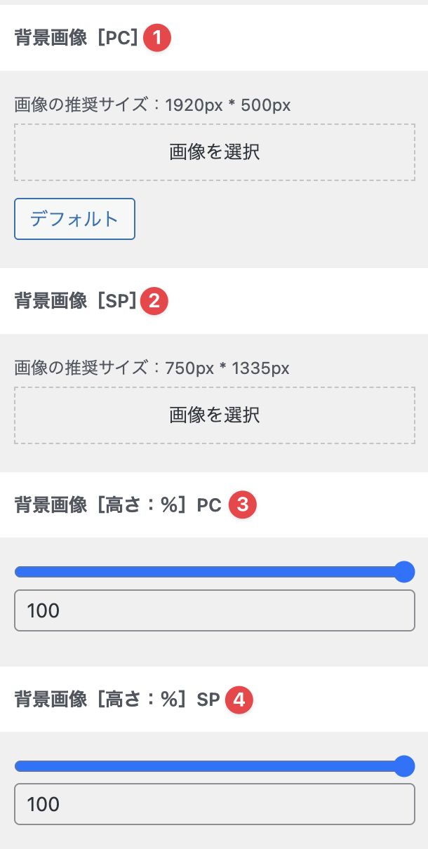 - 背景画像[高さ:%]:PC:スマホ表示で適用。ヘッダーアイキャッチの全体の高さを指定します。