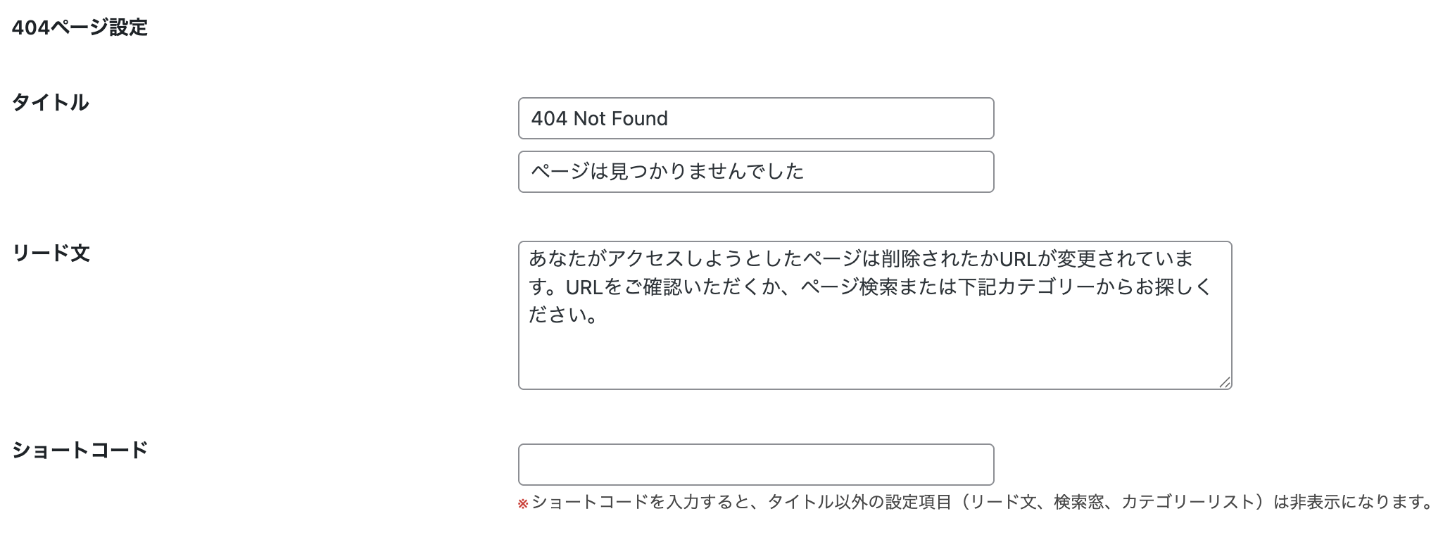 404ページのタイトル・リード文の文言を編集できる項目です。ショートコードに対応しており、Emanonパーツを使うことで、404ページのデザインの変更が可能です。