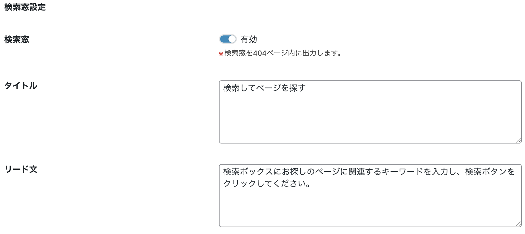 404ページ内に表示される検索窓を非表示にできます。文言の変更もできます。